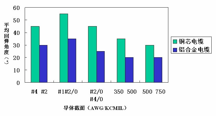 合金電纜的反彈性能比銅電纜少40%,在室溫條件下將銅電纜與合金電纜彎曲90度,應(yīng)力釋放后,電纜的平均反彈角度如圖所示: